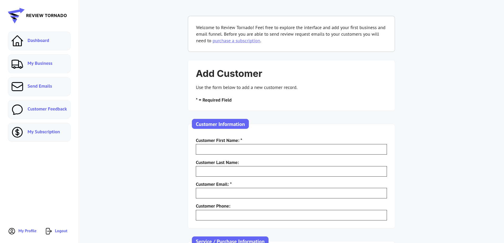 This form allows you to input information about your customer into the Review Tornado Dashboard. While you can add a customer if you only have their first name and email address, adding more information will help you keep better track of your customers and enable you to more easily contact a customer if they post negative private feedback.