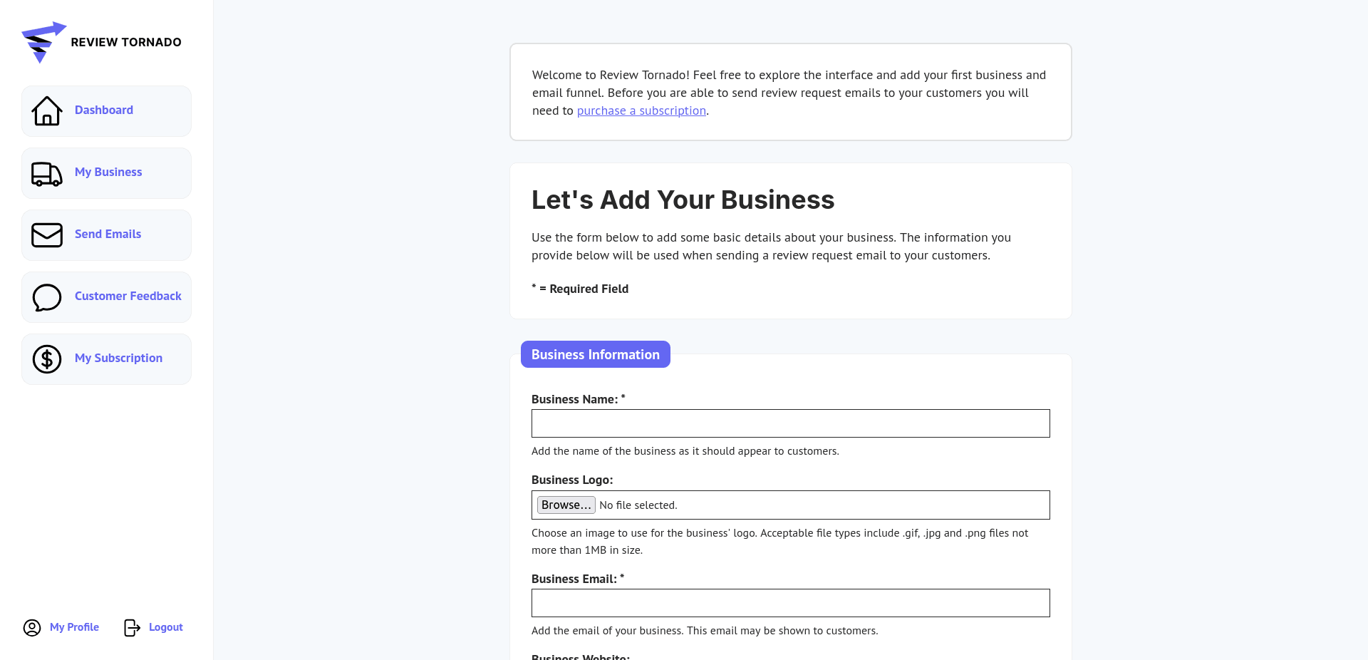 This form allows you to create your business inside of the Review Tornado Dashboard. Some of the information on this form, including the business name, logo, email address and mailing address will be shown to your customers.