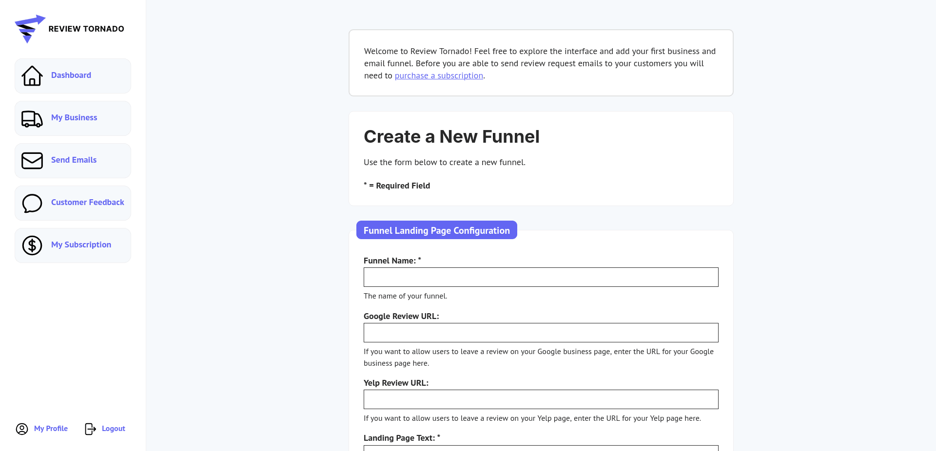 The first section of the form, entitled Funnel Landing Page Configuration controls basic information about your funnel and the landing page that your users will see when they click the link in the email they receive from Review Tornado.