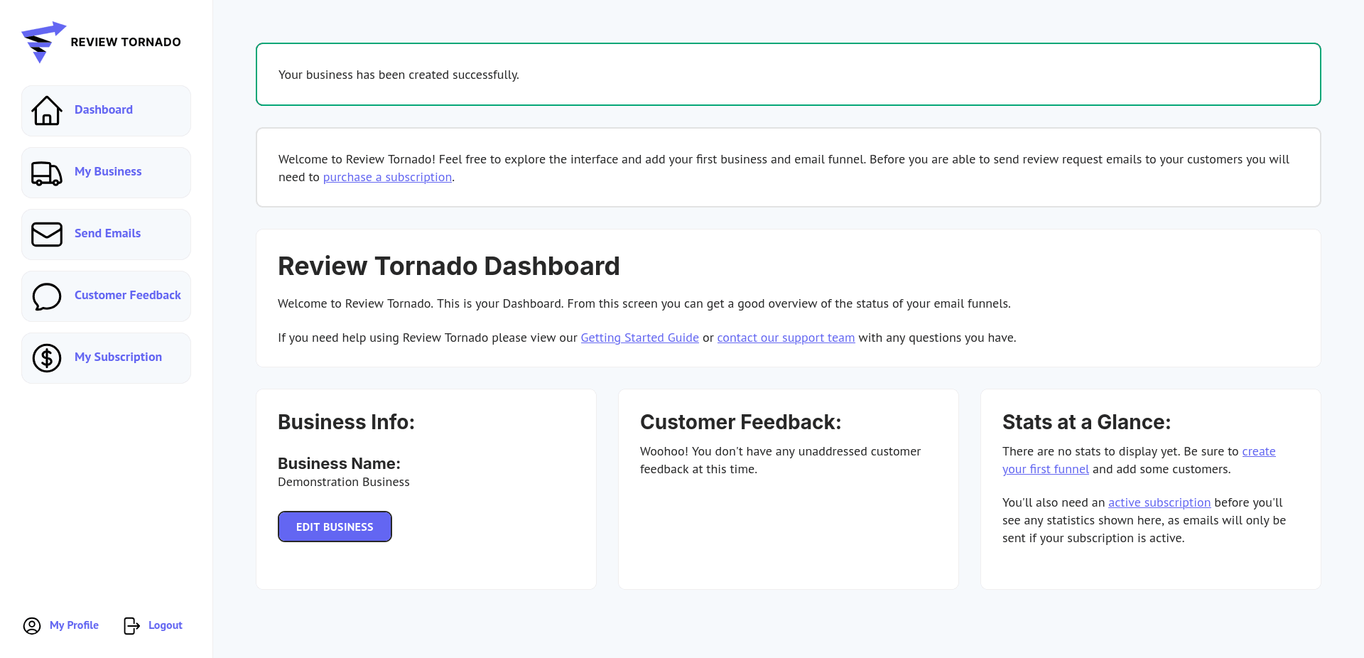 After saving your business, you should be on the main Dashboard screen, which looks like this: