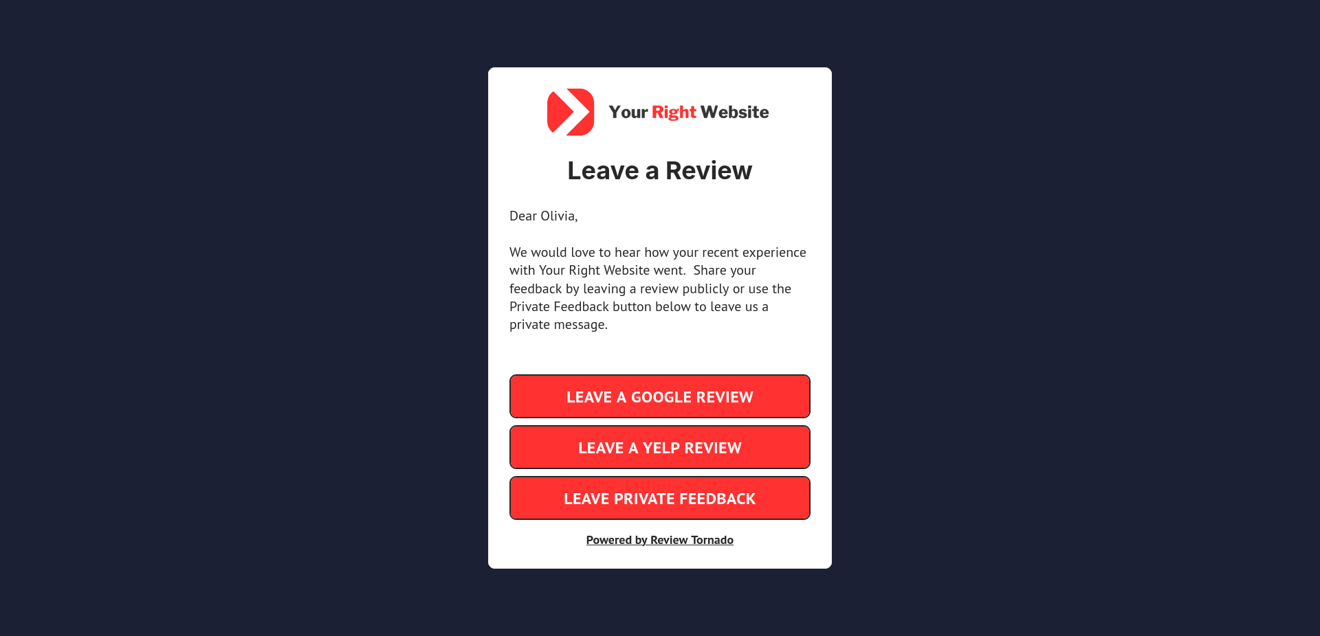 The text contained inside of this box is the text your customers will see when they land on the review request landing page. On this page they’ll see your business’ logo as well as the text you enter in this box. Below the text you enter, they’ll see buttons where they can click through to either Google or Yelp to leave a review, as well as a button where users can leave you private feedback.