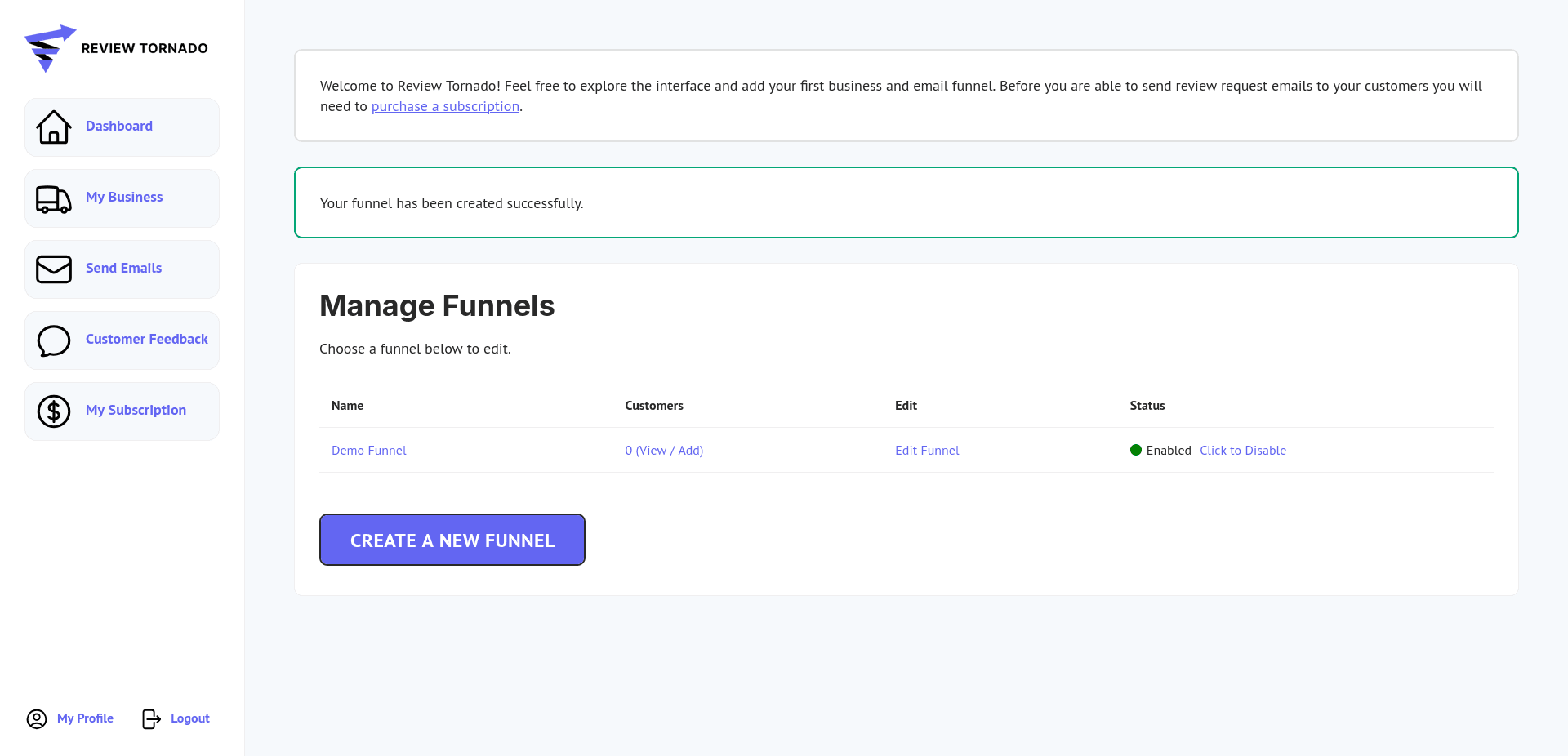 Each business on your account can have one or more email funnels. An email funnel determines what your customers will see when they receive a review request from Review Tornado. You can use one funnel for all your customers or have a different funnel for different customers or services.