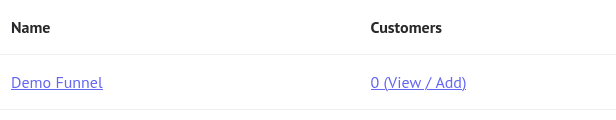 To add your first customer to your funnel, find your funnel in the table and click the View/Add link under the Customers column of the table.
