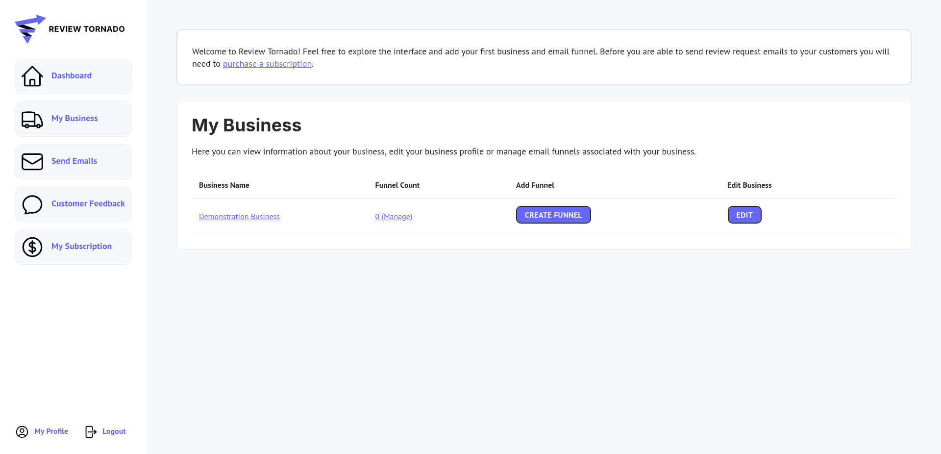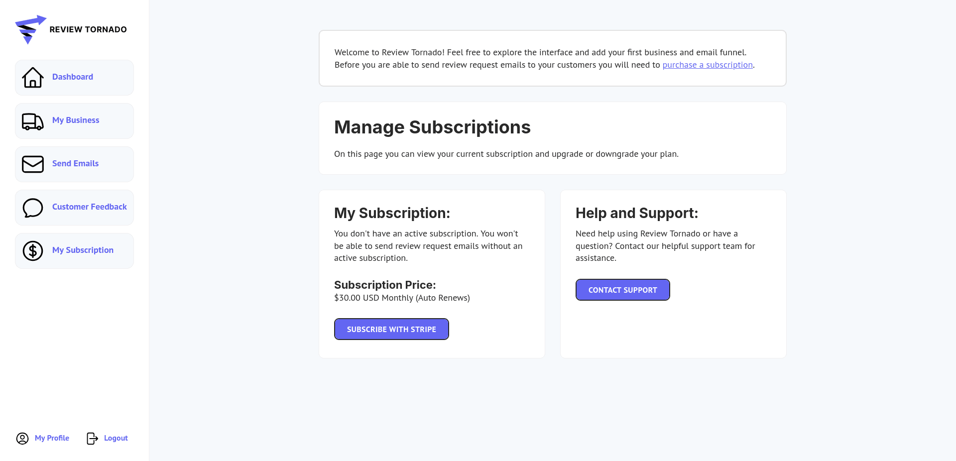 To purchase a subscription to Review Tornado click on the My Subscription button on the left hand sidebar.